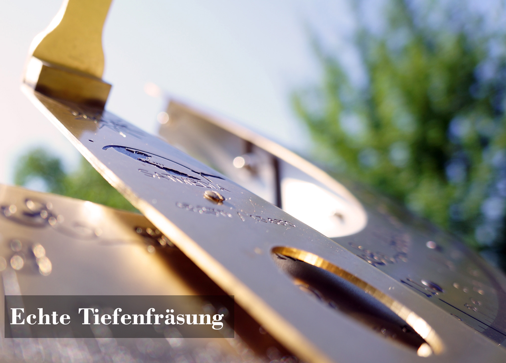 Alle Gravuren sind Tiefenfräßungen mit Lackauslegung und Klarlackversiegelung.