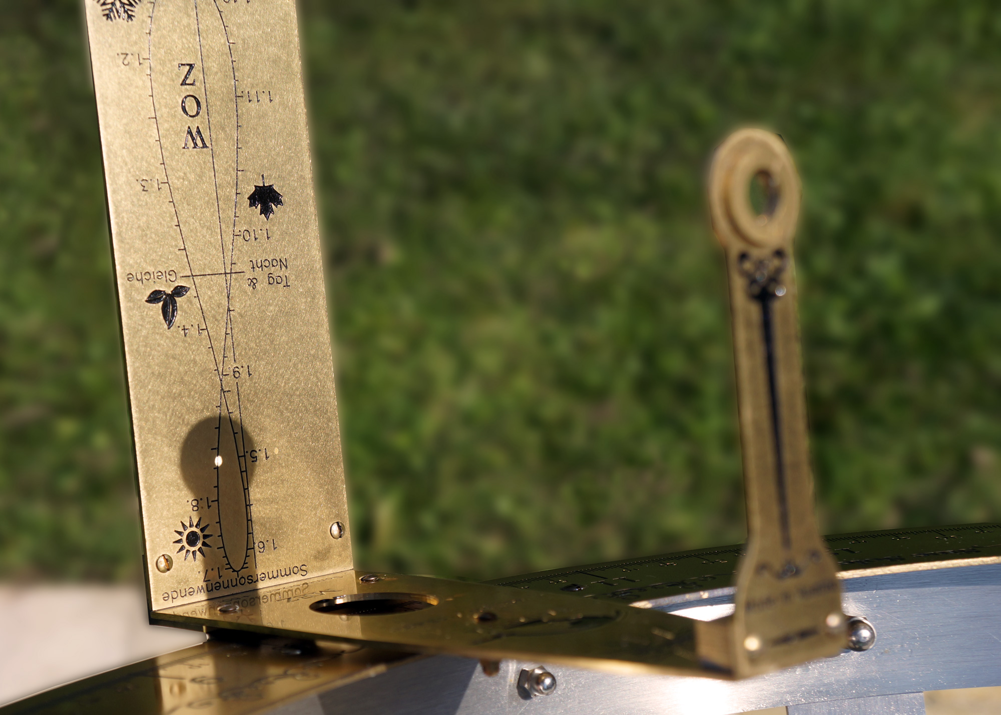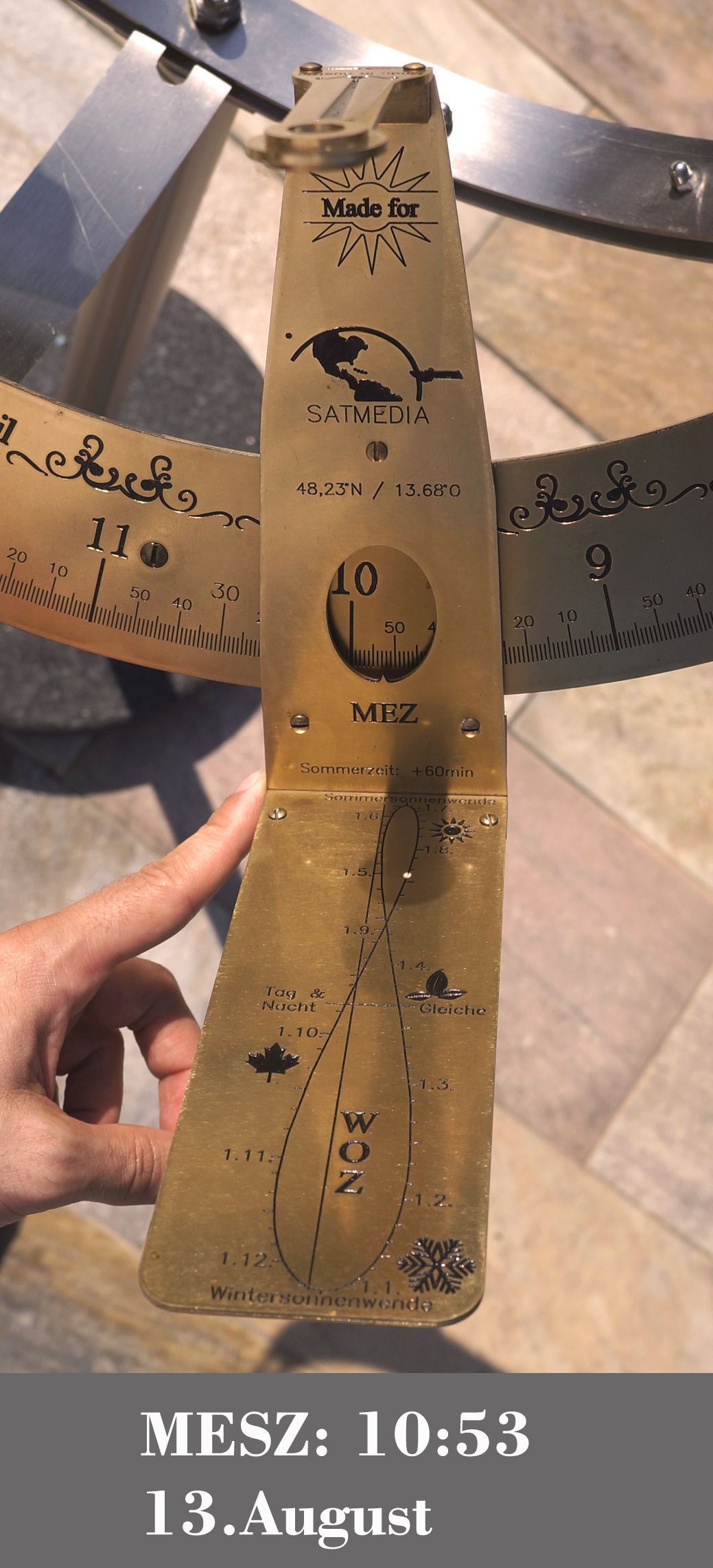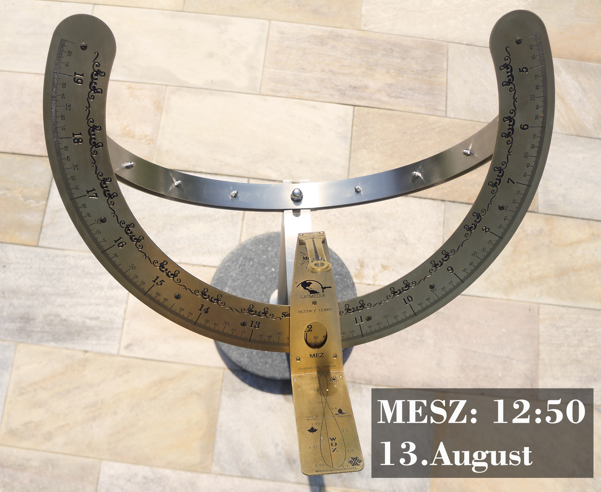 Der Sonnenstrahl wird auf die Datumslinie ausgerichtet. Das Sichtfenster zeigt die exakte MEZ. Für die Sommerzeit muss eine Stunde addiert werden.
