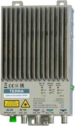 Der optische Sender TERRA OT401 dient zur Übertragung von Fernsehsignalen über ein optisches Medium. Es wandelt eingehende Satellitensignale von einem Quatro-LNB um. Der eingebaute WDM-Multiplexer überträgt die beiden Signalgruppen getrennt, im II-Übertragungsfenster (1310 nm) und III-Übertragungsfenster (1550 nm), was eine außergewöhnliche Übertragungsqualität garantiert. Der optische Ausgang (FC/APC – Angled Physical Contact) des Senders OT401 liefert ein optisches Signal mit 6 dBm Pegel, was eine Aufteilung und Verteilung des Signals sogar an 32 Knoten im Umkreis von bis zu 10 km eingesetzt, verbunden über Singlemode-Fasern. Die genaue Anzahl der Anschlusspunkte und die maximalen Entfernungen zur Signalquelle können bei der Planung des optischen Leistungsbudgets festgelegt werden. Jeder Eingang des Senders ist mit einer automatischen Verstärkungsregelung (AGC) ausgestattet, die die Signalstabilität gewährleistet (Kompensation von Signalpegelschwankungen in Verbindung mit wechselnden Wetterbedingungen – Regen, starke Wolken usw.). Folglich hat das optische Ausgangssignal eine konstante Modulationstiefe.